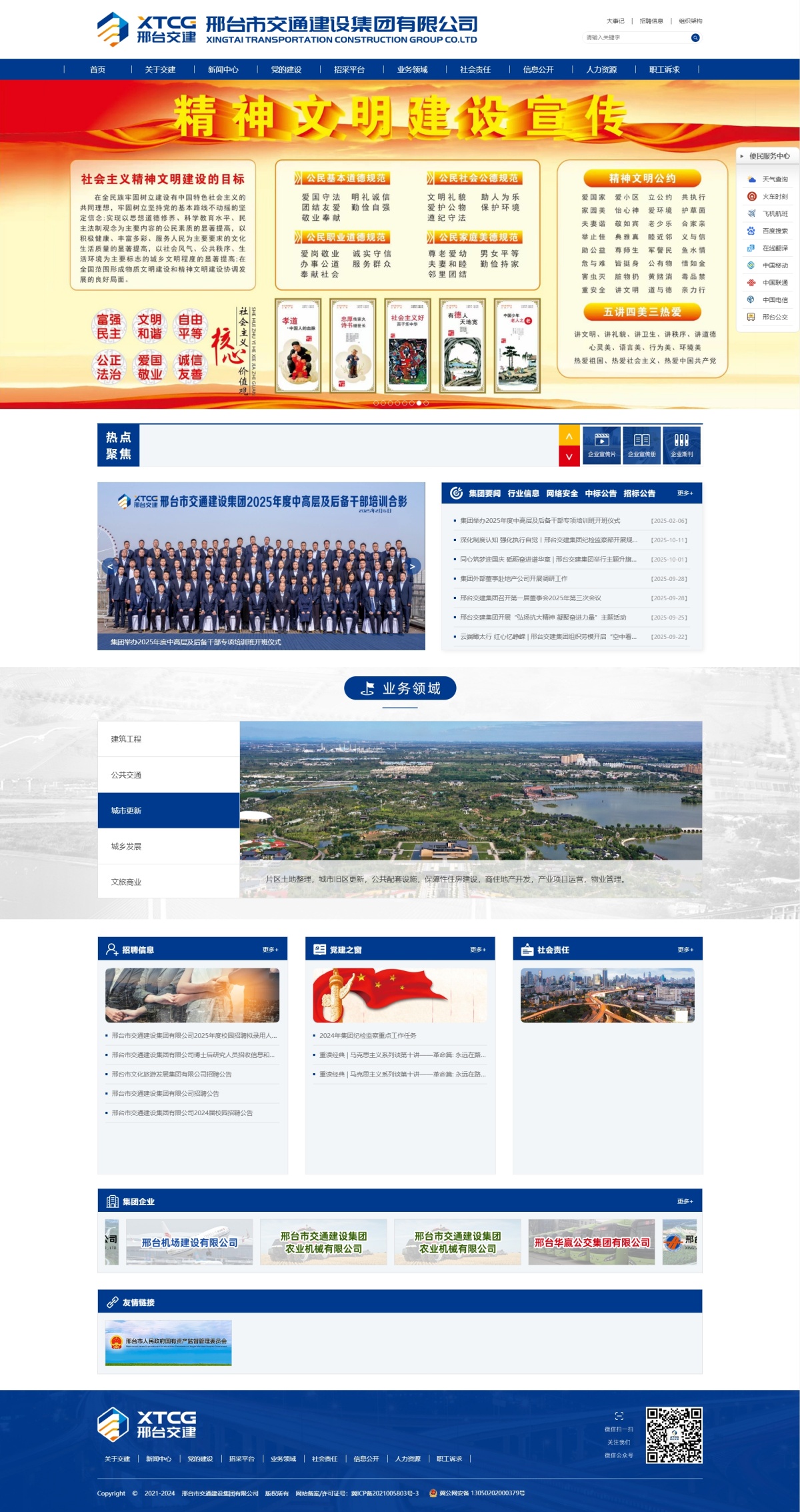 邢台交建集团以多领域产业投资集团战略目标为导向,立足城乡建设主力军、民生服务主力军发展定位,坚持“主业突出、多业并举、良性互动、产融结合”发展思路,围绕高质量发展主线,强化“5+X”战略发展布局,突出建筑工程、公共交通、城市更新、城乡发展、文旅商业等五大业务版块,以产业金融及投资、供应链服务等业务板块形成“X”业务集群,赋能“五指合拳”业务集群发展。